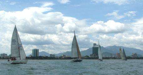 | Các thuyền buồm tham gia Cuộc đua thuyền buồm quốc tế Hồng Kông - Việt Nam 2008 diễu hành trên vịnh Nha Trang. |