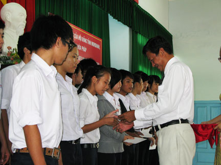 | Ông Lê Trung - Chủ nhiệm Trung tâm tiếng Pháp Nha Trang - thay mặt Hội đồng tỉnh Morbihan trao học bổng cho học sinh các lớp song ngữ Trường THPT Nguyễn Văn Trỗi. |