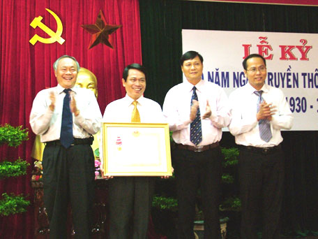 | Thừa ủy nhiệm của Chủ tịch nước, ông Nguyễn Văn Tự - Ủy viên Trung ương Đảng (bìa trái) trao Huân chương Lao động hạng Nhì cho Văn phòng Tỉnh ủy Khánh Hòa. |