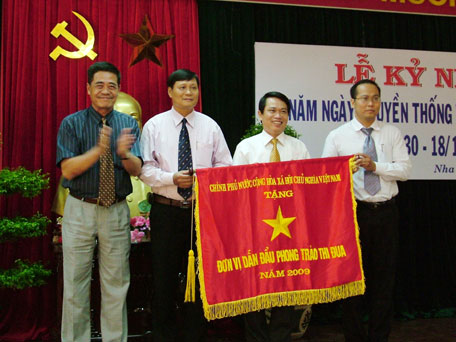 Thừa ủy nhiệm của Thủ tướng Chính phủ, ông Lê Thanh Quang - Bí thư Tỉnh ủy, Chủ tịch HĐND tỉnh Khánh Hòa (bìa trái) trao cờ đơn vị dẫn đầu phong trào thi đua cho Văn phòng Tỉnh ủy Khánh Hòa.