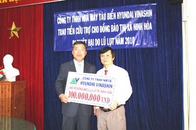 Nhằm góp phần chia sẻ, động viên người dân Ninh Hòa vượt qua khó khăn do hậu quả lũ lụt gây ra, mới đây, Công ty TNHH Nhà máy Tàu biển Hyundai VinaShin (HVS) hỗ trợ 100 triệu đồng cho đồng bào bị lũ lụt tại thị xã Ninh Hòa. Tại buổi hỗ trợ, ông Song Cheol Won - Tổng Giám đốc HVS đã gửi lời thăm hỏi đến người dân bị thiệt hại do lũ lụt năm 2010 trên địa bàn thị xã Ninh Hòa.