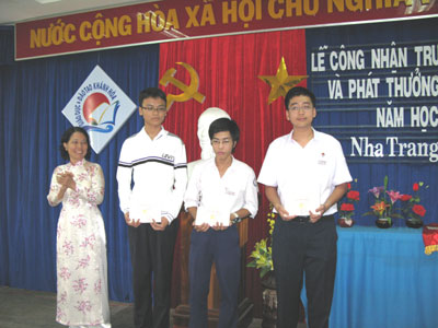 | Bà Lê Thị Hòa - Phó Giám đốc Sở Giáo dục - Đào tạo trao giấy chứng nhận cho 3 học sinh đạt giải nhất kỳ thi học sinh giỏi cấp tỉnh. |