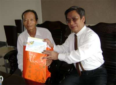 | Ông Lê Xuân Thân, Phó chủ tịch UBND tỉnh Khánh Hòa (bên phải) tặng quà ông Phạm Ngọc Quế, nguyên Chủ tịch Ủy ban Kháng chiến tỉnh. |