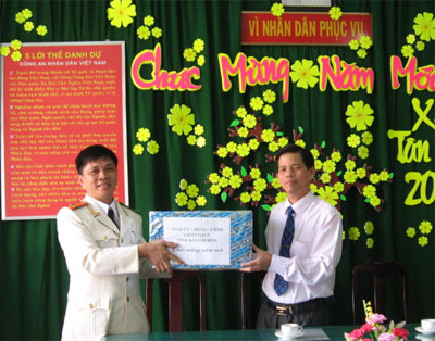 | Ông Nguyễn Tấn Tuân - Phó Bí thư Thường trực Tỉnh ủy Khánh Hòa (bên phải) thăm, chúc Tết và tặng quà của Tỉnh ủy, HĐND, UBND và Ủy ban Mặt trận Tổ quốc Việt Nam tỉnh Khánh Hòa cho cán bộ, chiến sĩ Đội Cảnh sát Giao thông Công an TP. Nha Trang. |
