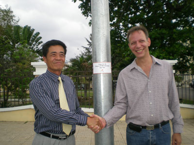 | Ông Lê Thanh Quang - Ủy viên Trung ương Đảng, Bí thư Tỉnh ủy, Chủ tịch HĐND tỉnh Khánh Hòa (bên trái) chứng nhận lễ bàn giao 20 trụ đèn chay bằng năng lượng mặt trời và sức gió do Công ty Cổ phần Bất động sản Hà Quang đầu tư. |
