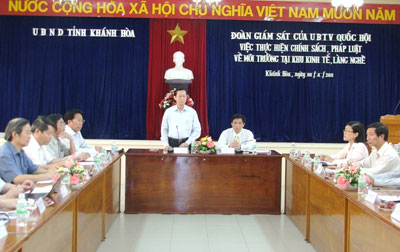 Tại buổi làm việc, Đoàn giám sát của UBTVQH đã nghe lãnh đạo Sở Tài nguyên và Môi trường báo cáo việc thực hiện chính sách, pháp luật về môi trường tại KKT và các làng nghề trên địa bàn tỉnh. Theo đó, bên cạnh việc ban hành các văn bản quy phạm pháp luật theo thẩm quyền, UBND tỉnh còn chú trọng việc chỉ đạo thực hiện các chính sách, pháp luật về môi trường tại các KKT, làng nghề trên địa bàn. Tại KKT Vân Phong, phần lớn các dự án khi đi vào hoạt động đều triển khai đầy đủ công tác bảo vệ môi trường (BVMT) theo báo cáo đánh giá tác động môi trường hoặc bản cam kết BVMT được phê duyệt. Riêng vấn đề nix thải của Công ty TNHH Nhà máy tàu biển Hyundai VinaShin đến nay vẫn chưa được giải quyết dứt điểm. Tại các làng nghề trên địa bàn tỉnh, số lượng cơ sở có hồ sơ môi trường rất thấp. Giai đoạn 2006 - 2009, trên địa bàn tỉnh có 97 vụ việc vi phạm pháp luật về BVMT, xử phạt vi phạm hành chính gần 940 triệu đồng.