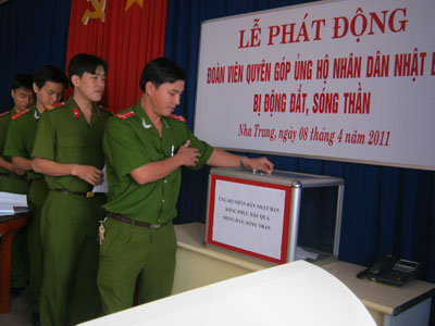 | Đại diện ĐV, TN các đơn vị Công an tỉnh tham gia quyên góp giúp nhân dân Nhật Bản. |