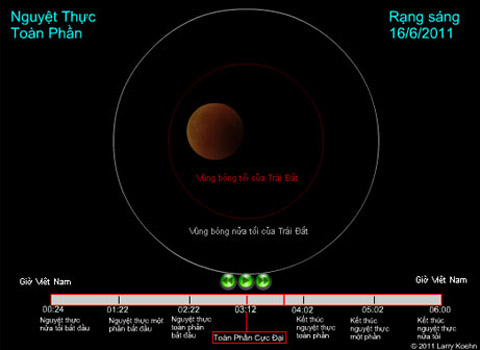 Theo ông Duy, thời điểm để bắt đầu quan sát rõ nhất là từ 1h22, mặt trăng sẽ vào vùng bóng tối của trái đất, bắt đầu giai đoạn nguyệt thực một phần, màu sắc của vùng bóng trái đất in trên mặt trăng sẽ chuyển dần từ đen xám sang ửng đỏ khi vùng bóng này lớn dần.