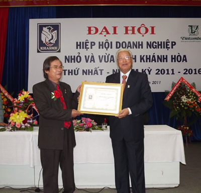 | Ông Cao Sỹ Kiêm - Chủ tịch Hiệp hội Doanh nghiệp nhỏ và vừa Việt Nam (bên phải) trao bằng chứng nhận cho Hiệp hội Doanh nghiệp nhỏ và vừa tỉnh Khánh Hòa. |