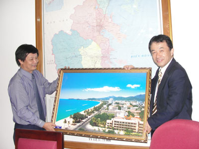 | Ông Trần Sơn Hải - Ủy viên Ban Thường vụ Tỉnh ủy - Phó Chủ tịch Thường trực UBND tỉnh Khánh Hòa (trái) tặng quà lưu niệm cho ông Tomoyuki Kimura - Giám đốc Quốc gia Ngân hàng Phát triển châu Á (ADB) tại Việt Nam. |