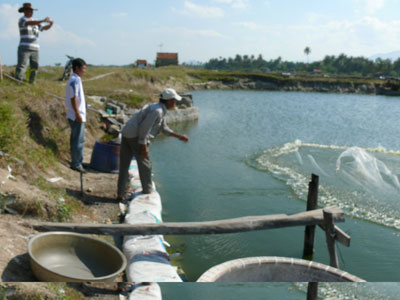 | Ngoài học lý thuyết, người dân còn được trực tiếp tìm hiểu các thao tác nuôi tôm thẻ chân trắng theo quy trình GAP. |