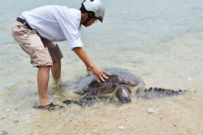 Một con rùa quý hiếm vừa được Trạm Khai thác và bảo vệ nguồn lợi thủy sản thị xã Ninh Hòa thả về biển trưa 15-9-2011.