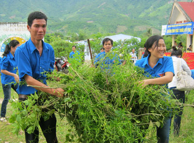 | Đoàn viên, thanh niên giúp dân phát quang bụi rậm. |
