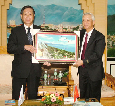 | Ông Nguyễn Chiến Thắng - Phó Bí thư Tỉnh ủy, Chủ tịch UBND tỉnh Khánh Hòa (bên phải) tặng quà lưu niệm cho ông Shigetaka Sato. |