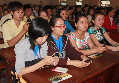 | Sinh viên Trường Cao đẳng Văn hóa Nghệ thuật và Du lịch Nha Trang bầu chọn cho vịnh Hạ Long qua điện thoại di động. |