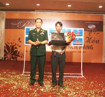 | Ông Trần Đình Tiến - Giám đốc Chi nhánh Viettel Khánh Hòa trao giải cho khách hàng may mắn trúng thưởng. |