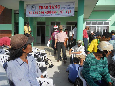 Sáng 12-3, tại Hội Chữ thập đỏ TP. Cam Ranh, Trung tâm Phục hồi chức năng - Giáo dục trẻ em khuyết tật tỉnh phối hợp với Hội Chữ thập đỏ thành phố và Tổ chức Xe lăn quốc tế trao 100 chiếc xe lăn cho người khuyết tật của huyện Khánh Sơn và TP. Cam Ranh. Trị giá mỗi chiếc khoảng 1,8 triệu đồng, do Tổ chức Xe lăn quốc tế tài trợ.