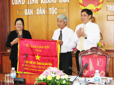 | Ông Lê Đức Vinh - Uỷ viên Ban Thường vụ Tỉnh ủy, Phó Chủ tịch UBND tỉnh Khánh Hòa tặng cờ thi đua của Uỷ ban Dân tộc cho Ban Dân tộc tỉnh. |