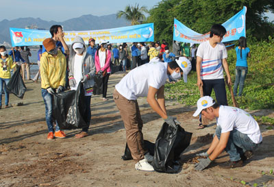 | Các lực lượng tham gia dọn vệ sinh bãi biển. |
