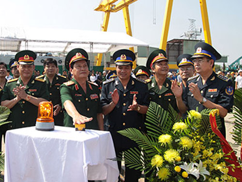 | Thượng tướng Nguyễn Thành Cung nhấn nút hạ thuỷ tàu CBS 8001 |