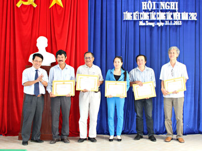 | Ông Trần Duy Hưng - Tổng Biên tập Báo Khánh Hòa (bìa trái) khen thưởng các cộng tác viên. |