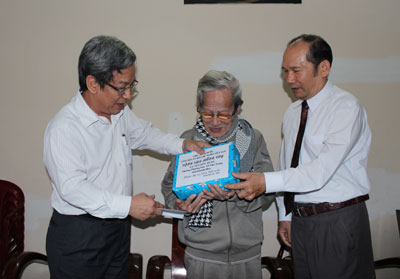 | Ông Lê Xuân Thân (bên trái) trao quà cho cụ ông Nguyễn Dụng. |