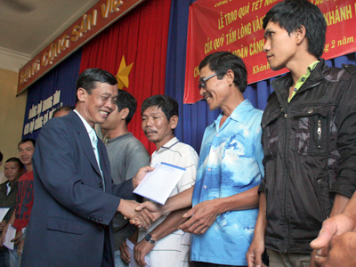 Lãnh đạo Liên đoàn Lao động tỉnh Khánh Hòa đại diện cho các đơn vị trao quà tết cho các ngư dân có hoàn cảnh khó khăn. |