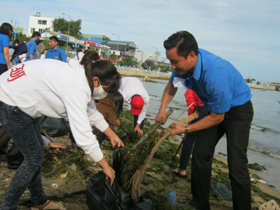 | Đoàn viên thanh niên Nha Trang tham gia dọn vệ sinh môi trường. |