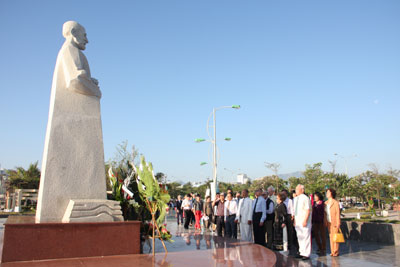 | Các thành viên Hội Ái mộ A.Yersin dâng hoa tại tượng đài bác sĩ Yersin. |