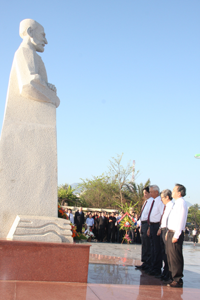 Ông Nguyễn Chiến Thắng (thứ 3 từ phải sang) dâng hoa tại tượng đài bác sĩ A.Yersin. Ảnh: Nhân Tâm |