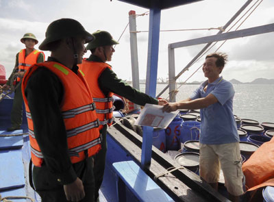 | Cán bộ Đồn Biên phòng Cam Ranh kiểm tra công tác đảm bảo an toàn trên tàu của ngư dân trước khi ra khơi. |