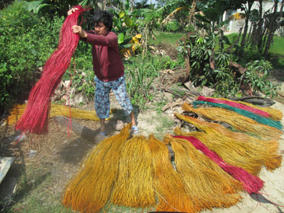 | Một hộ làm chiếu ở làng Mỹ Trạch tranh thủ nắng phơi dây cói. |