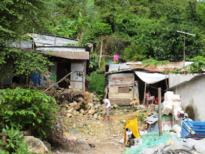 Từ chợ Hòn Rớ, theo con đường nhỏ ngoằn nghoèo đi ngược con suối nhỏ lên núi Hòn Rớ là xóm Núi. Đây là khu dân cư có một phần nằm chênh vênh bên sườn núi, một phần nằm lọt trong thung lũng nhỏ với nhiều nhà cửa rất tạm bợ. Bà Nguyễn Thị Kim Liên (số nhà 146) cho hay, xóm gồm dân nghèo từ nhiều nơi về đây ở, riêng gia đình bà ở đây đã gần 10 năm. Cũng như nhiều hộ dân trong xóm, nhà của bà rất tạm bợ, mái lợp tôn, vách cũng được dựng bằng tôn, ván, tấm nhựa. Phía sau nhà là sườn núi cao, có khối đá mồ côi. Phía trước nhà là một vực cao khoảng 3m được kè bằng đá san hô. Vì thế, mỗi lần có mưa to, bà luôn lo sợ đất đá phía sau có thể sạt lở làm sập nhà. Đặc biệt khi có bão, để đảm bảo an toàn, bà cùng nhiều người trong xóm phải sơ tán theo yêu cầu của chính quyền. “Mưa đến là nước trên núi ầm ầm đổ xuống, có khi kéo theo cả đá cục, có khi gây sạt lở đất, khiến nhà cửa rung lên răng rắc, ngồi trong nhà mà sợ hãi” - bà Liên chia sẻ.
