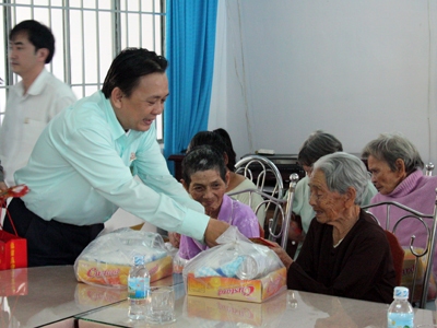 Ông Lê Hữu Hoàng – Tổng Giám đốc Công ty TNHH Nhà nước Một thành viên Yến sào Khánh Hòa trao quà Tết cho người già neo đơn được chăm sóc tại Trung tâm Bảo trợ xã hội tỉnh Khánh Hòa. |