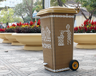 Đó là loại thùng rác đôi, được làm từ nhựa cao cấp, chân đế bằng sắt sơn tĩnh điện. Được sơn màu cam nổi bật với nền xanh của cây cối, tạo điểm nhấn giúp mọi người có thể dễ dàng nhận ra nơi bỏ rác đúng quy định nhưng vẫn hài hòa với cảnh sắc xung quanh. Các thùng rác mới được bố trí ở khu vực này do Công ty TNHH TM-SX Tiến Ngọc (TP. HCM) tài trợ với tổng cộng 4 cặp thùng rác và mỗi cặp có trị giá 4,7 triệu đồng.