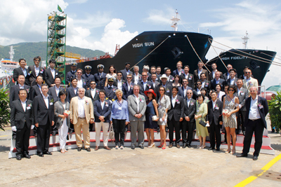 Lãnh đạo Công ty TNHH Nhà máy Tàu biển Hyundai VinaShin và các đối tác tại lễ đặt tên tàu. |