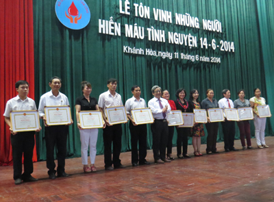 Tại buổi lễ, có 7 hộ gia đình, 6 tập thể, 30 cá nhân được nhận bằng khen của UBND tỉnh, Ban chỉ đạo Vận động HMTN tỉnh tặng giấy khen cho 83 tập thể, 19 hộ gia đình và 296 cá nhân. Những năm qua, phong trào HMTN tại tỉnh Khánh Hòa phát triển mạnh và đồng đều ở hầu hết các địa phương, lượng máu hiến cung ứng gần 100% nhu cầu về máu cho cấp cứu và điều trị.