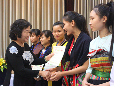 Tối 26-7, tại TP. Nha Trang, Quỹ Học bổng Vừ A Dính phối hợp với Quỹ Tài trợ VinaCapital tổ chức tổng kết chương trình “Ngày hội ước mơ” và trao học bổng cho các nữ sinh xuất sắc của 24 dân tộc thiểu số thuộc 27 tỉnh, thành phố trên cả nước. Bà Trương Mỹ Hoa - Nguyên Phó Chủ tịch nước, Chủ tịch Quỹ Học bổng Vừ A Dính đến dự.