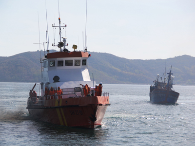 Tàu SAR27-01 lai dắt tàu bị nạn cùng 12 ngư dân vào vịnh Nha Trang. |