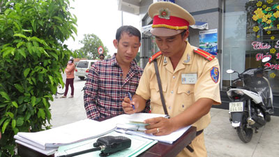 | Lập biên bản xử lý người tham gia giao thông vi phạm về tốc độ (Ảnh chụp sáng 19-8 tại đường Trần Quý Cáp) |