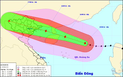 Bão số 3 (tên quốc tế là Kalmaegi) đang tiếp tục mạnh thêm, sức gió mạnh nhất vùng gần tâm bão cấp 12, cấp 13, giật cấp 15, cấp 16 và di chuyển nhanh về phía đất liền nước ta; ngày và đêm 16/9, bão sẽ ảnh hưởng trực tiếp đến vùng biển Vịnh Bắc Bộ và các tỉnh ven biển từ Quảng Ninh đến Nghệ An với sức gió mạnh nhất vùng gần tâm bão cấp 11, cấp 12, giật cấp 13, cấp 14, kèm theo mưa lớn trên diện rộng. Đây là cơn bão rất mạnh, di chuyển nhanh, diễn biến của bão còn phức tạp, cần đề phòng bão đổ bộ sớm hơn dự báo.