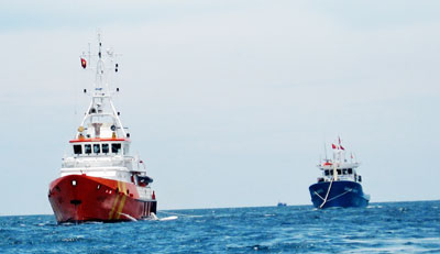 | Tàu SAR-413 của VMRCC lai dắt tàu cá vỏ thép Hoàng Anh 01 bị nạn ở vùng biển Hoàng Sa về Cảng Nha Trang. |