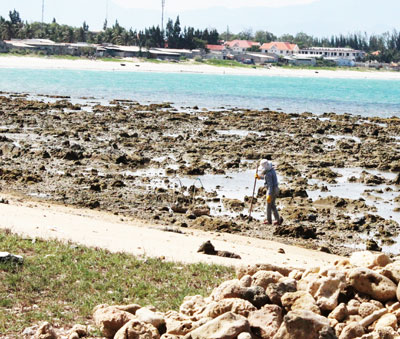 | Người dân đang khai thác san hô tại khu vực bãi triều tổ dân phố Mỹ Á. |