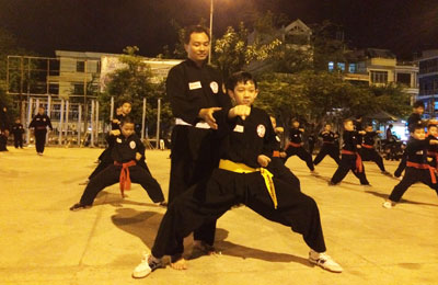 | Anh Bình dạy võ ở Câu lạc bộ Võ thuật Nhà Văn hóa Thanh niên. |