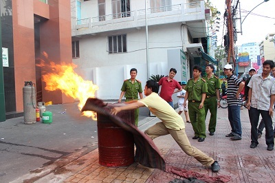 | Các học viên thực hành thao tác sử dụng dụng cụ chữa cháy để dập tắt đám cháy. |