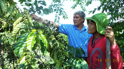 | Cán bộ Hội Nông dân đang hướng dẫn anh Cao Hồ Văn chăm sóc cà phê. |