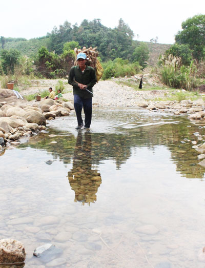| Người dân xã Sơn Thái gùi nông sản từ cánh đồng Bến Lội qua sông để bán |