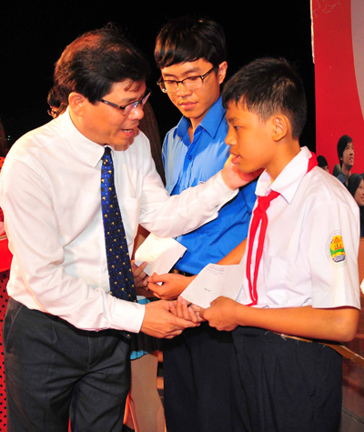 | Ông Nguyễn Tấn Tuân trao học bổng cho các học sinh nghèo vượt khó |