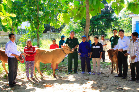 | Trao bò cho các hộ nghèo xã Khánh Phú. |
