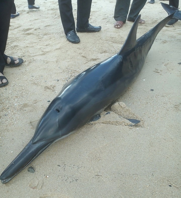 | Nhân viên Khu du lịch Đảo Hoa Lan phát hiện con cá heo dạt vào bờ. |